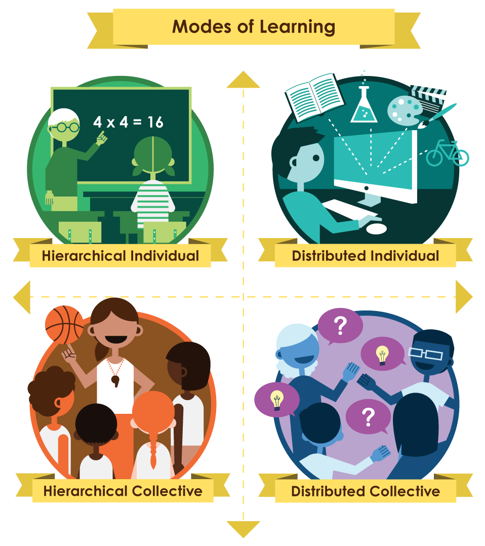 Model ma postać prostej macierzy 2×2. Na osi poziomej znajduje się podział na Hierarchical (wiedza jest przekazywana w uporządkowanej i logicznej formie) i Distributed (wiedza jest rozproszona i uczeń wybiera źródło wiedzy). Na osi pionowej mamy podział na Individual (samodzielna nauka) i Collective (uczenie w grupie).